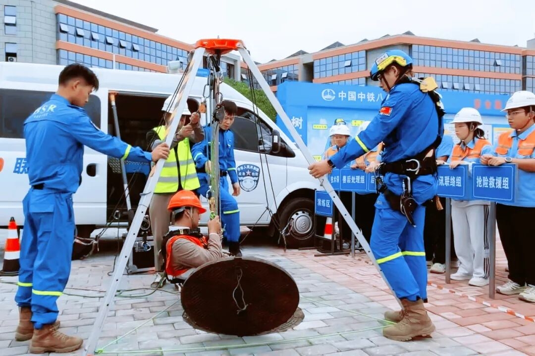 基于施工区域内雨污水管网分布密集的地形特点,本次演练特意设置了“有限空间作业人员突发昏迷”的场景。在接到协作班组的险情报告后,项目演练总指挥启动专项应急预案。各应急小组迅速抵达事故现场,安全保卫组组织疏散并设立警戒区;抢险救援组严格执行“先通风、再检测、后救援”程序,在确保环境安全后,佩戴防护装备入内施救,成功将昏迷人员转移至安全区域;医疗救援组随即对伤员进行心肺复苏等急救,并安排送医。演练结束后,蓝天救援队专家就救援细节和设备使用进行了现场指导,并邀请项目管理人员和管网施工现场工人参与实际操作体验。
