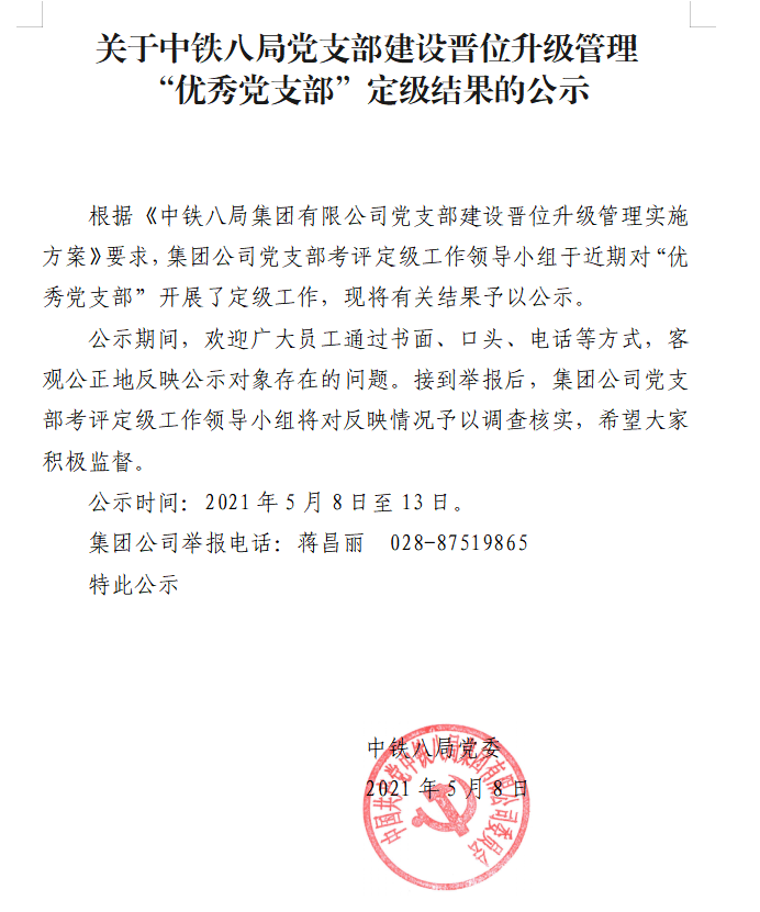 关于中铁八局党支部建设晋位升级管理 “优秀党支部”定级结果的公示