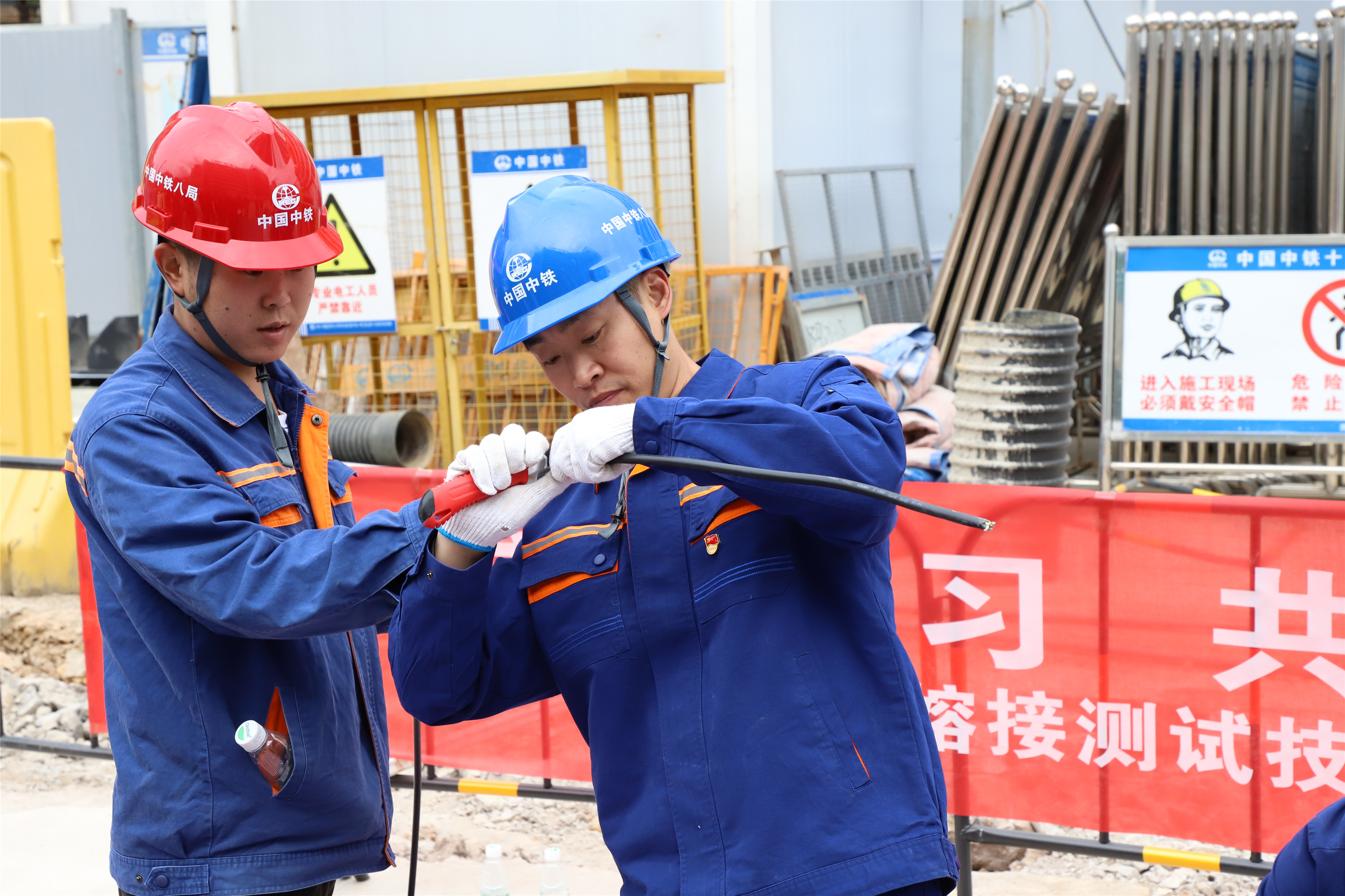 活动紧密结合贵阳轨道交通3号线一期管线迁改及临电、临水工程实际情况,不仅安排了施工现场观摩和技术交流,还进行了“相互交流学习,共同提高技艺”光纤熔接技能比赛。两家单位各派四人组队,在规定时间内进行24芯光纤熔接。赛场上,两队选手全神贯注地进行剥缆、固定、熔纤、盘纤等步骤。剥出的纤芯细如毫发,分秒必争的比赛考验着每一位选手的细心和耐心,紧张的氛围使场边不时响起“别慌别慌”、“稳住稳住”的助威声……