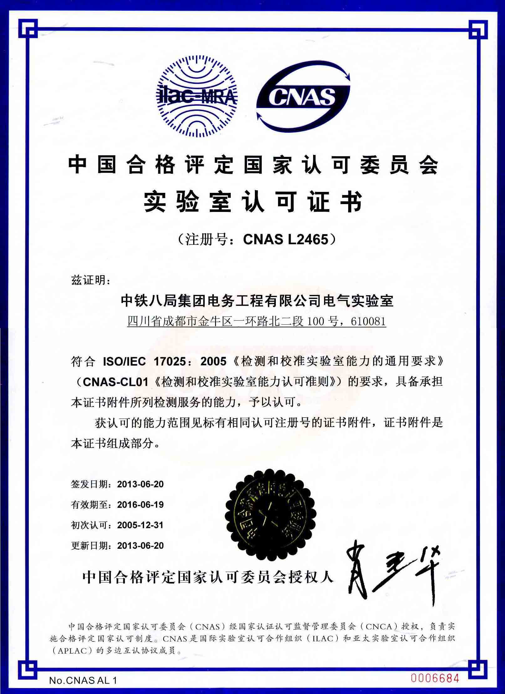 试验室认可证书