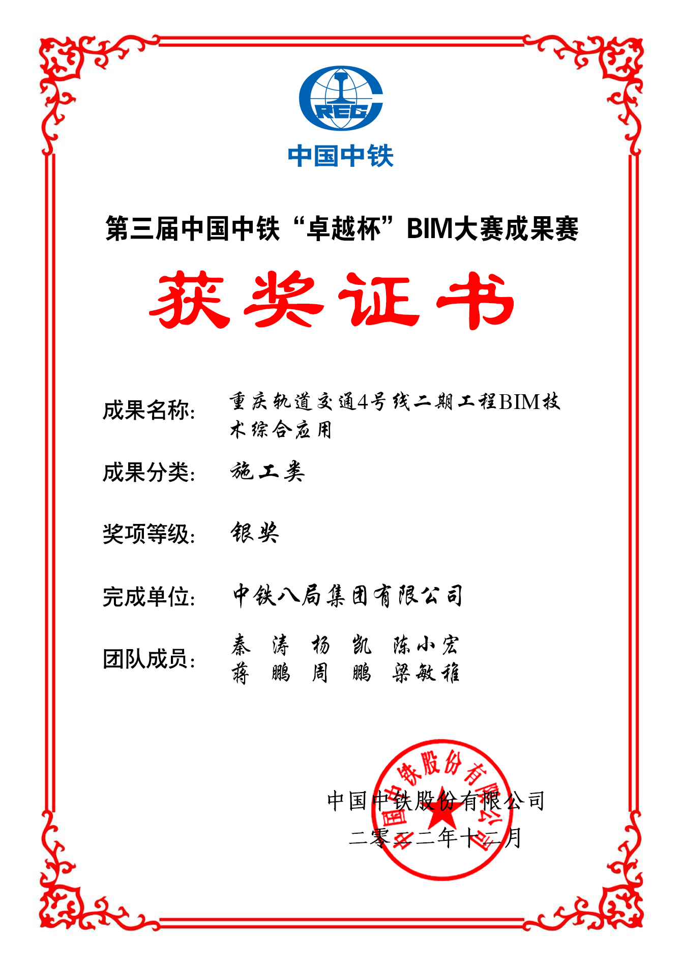 近日,第三届中国中铁“卓越杯”BIM大赛成果赛公布评选结果,由集团公司申报的《重庆轨道交通4号线二期BIM技术综合应用》获得施工组银奖,这也是继重庆市第五届建设工程BIM大赛一等奖、中国施工企业管理协会第三届工程建设行业BIM大赛一等成果之后获得的又一殊荣。