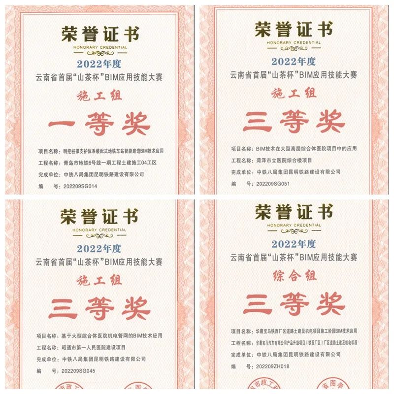 近日,2022年度云南省首届“山茶杯”BIM应用技能大赛颁奖典礼在昆举行,中铁八局4个参赛项目荣获一等奖1项,三等奖3项。