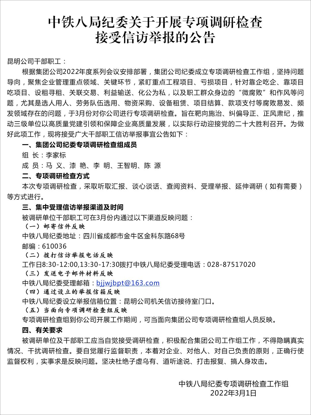 中铁八局纪委关于开展专项调研检查接受信访举报的公告