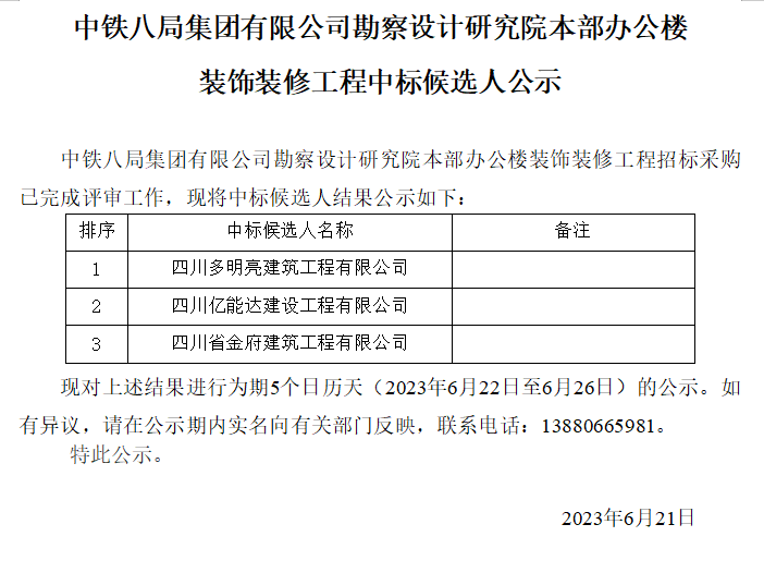 中铁八局集团有限公司勘察设计研究院本部办公楼装饰装修工程中标候选人公示