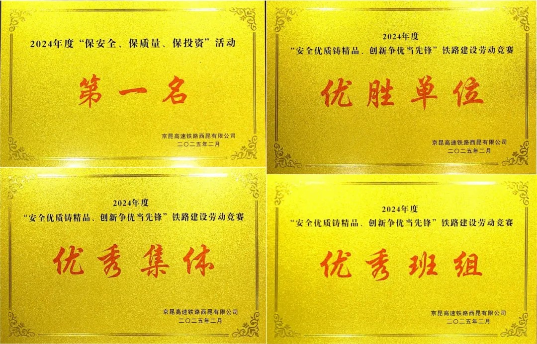 会上,京昆高铁西昆公司对2024年度“安全优质铸精品、创新争优当先锋”铁路建设劳动竞赛中的先进单位、集体和个人进行了表彰。渝昆高铁七标项目部凭借卓越表现,荣获“优胜单位”称号;项目部综合办公室荣获“优秀集体”称号;筠连隧道出口开挖班组荣获“优秀班组”称号;项目部2名职工荣获“先进个人”称号。此外,在渝昆高铁川渝段“保安全、保质量、保投资”活动考核中,中铁八局渝昆高铁七标项目部脱颖而出,排名第一,荣获“三保”活动优胜单位称号。