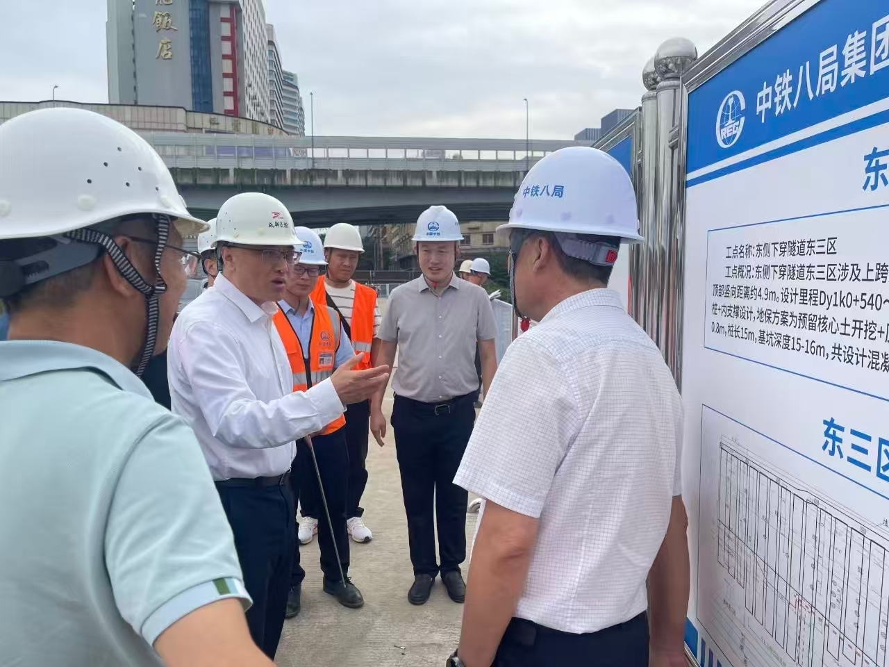 聂斌一行实地察看了东西两侧下穿铁路隧道东下穿及商贸大道施工现场,听取了项目负责人就施工进度,工艺工法,安全质量管控等方面的汇报。